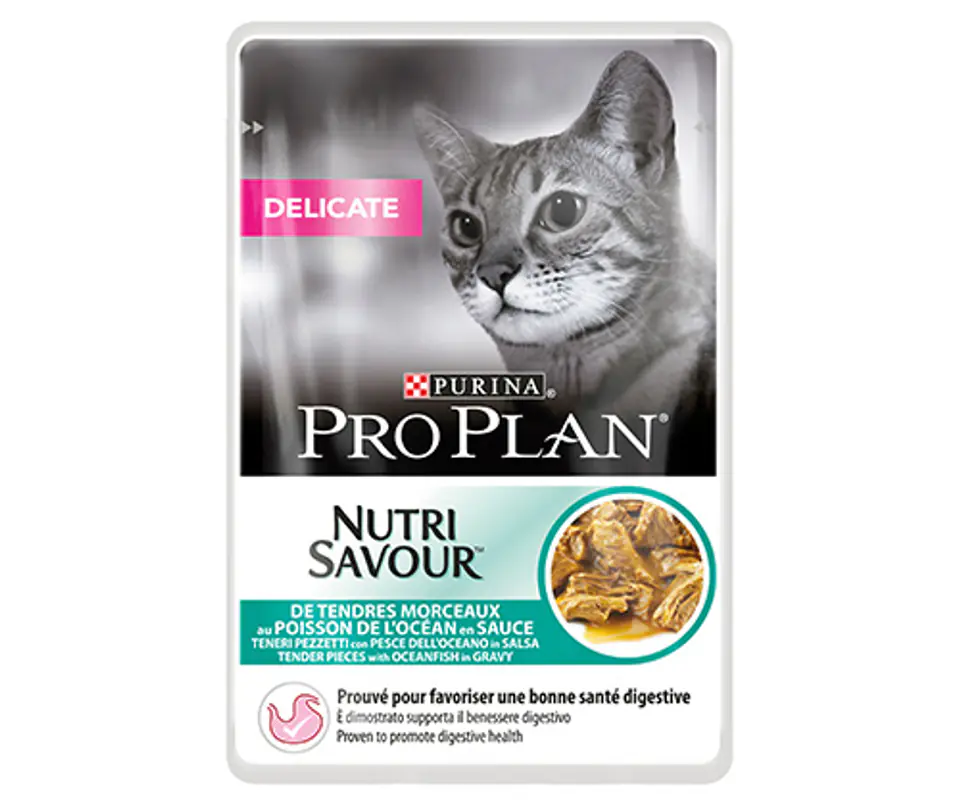 Purina Pro Plan Delicate is an extremely delicate and tasty food designed for cats with a sensitive digestive tract. The food also contains Omega-3 acids from DHA and EPA, which have a beneficial effect on the skin and cat's coat, which becomes healthy and shiny.
