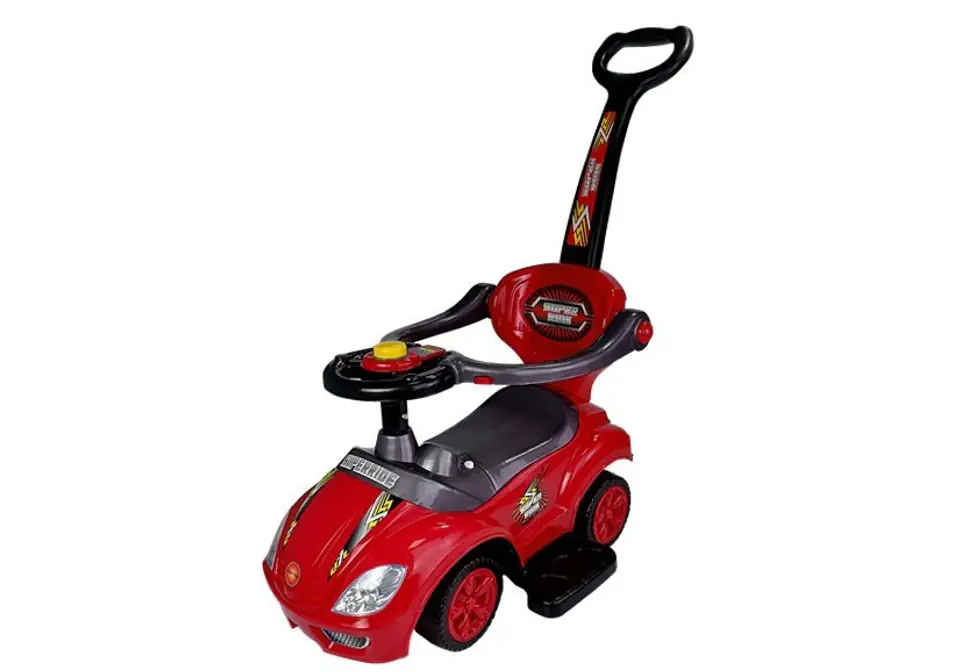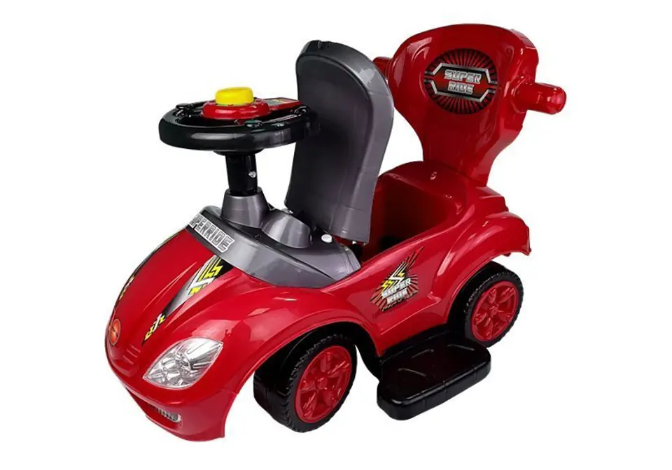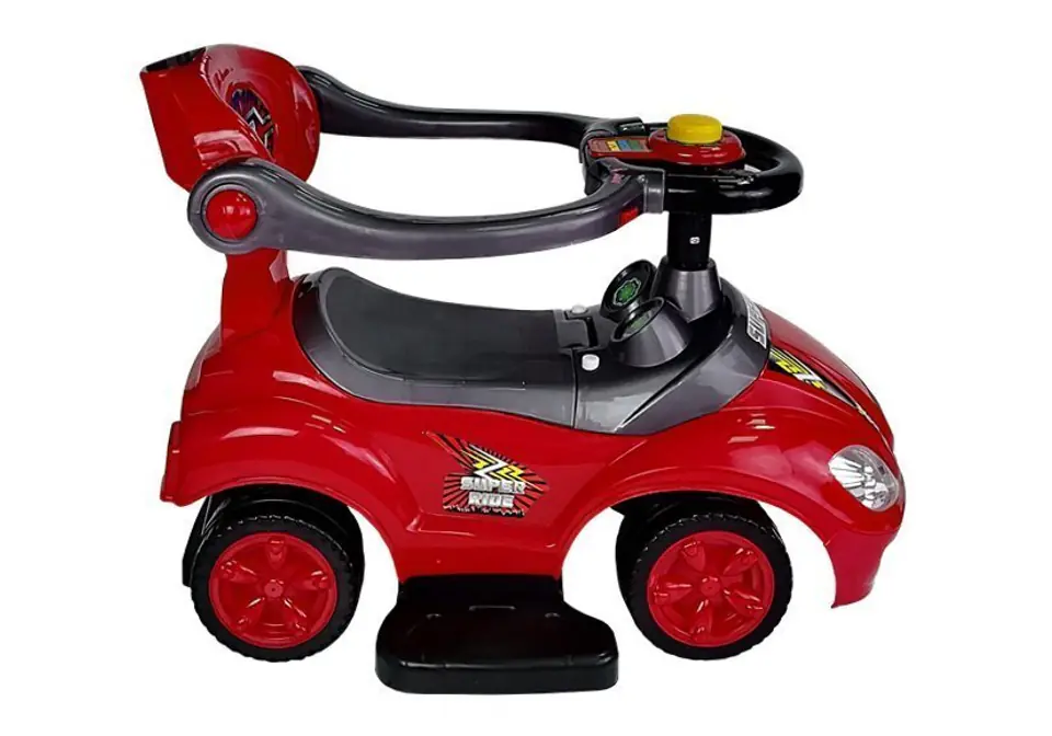 The Mega Car children's pusher ride has been designed for energetic teenagers who love to be outdoors. The car moves in a very simple way – it is enough for the caregiver to push the handle connected to the vehicle. When the child grows up and modifies the construction of his pusher, turning it into a ride-on, the little driver will take over the controls of his toy car, alternately pushing his legs off the ground. The baby pusher is a fantastic convenience for all parents, as it allows weekend walks and trips without having to take a stroller with you.