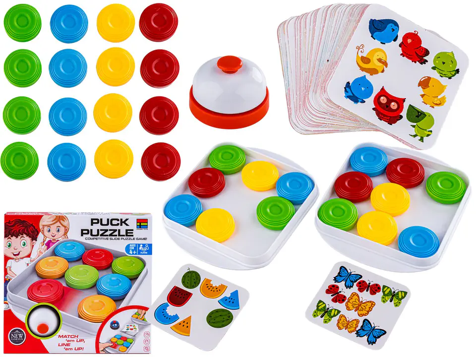 - The game is designed for 2 players. We put the cards on the table and turn one of them over - so that it is clearly visible to everyone. The goal of the game is to arrange the hand from the card as quickly as possible. The player who is the first to create the selected pattern rings the bell and takes the card. But beware: the layout must be identical to the one on the card, both the colors and location of the discs must match:) And most importantly - in order to arrange the pattern, we can not pick up the pucks from the board - they can only be moved.