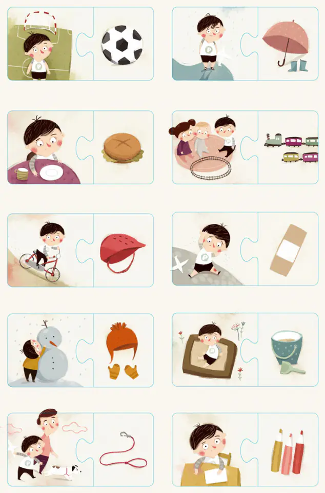 Two-element puzzles addressed to children from 2 years. Pucio is in the pictures in situations where something is missing. The child should look at the main picture, consider what is missing, and match the second element with the right object on the picture.