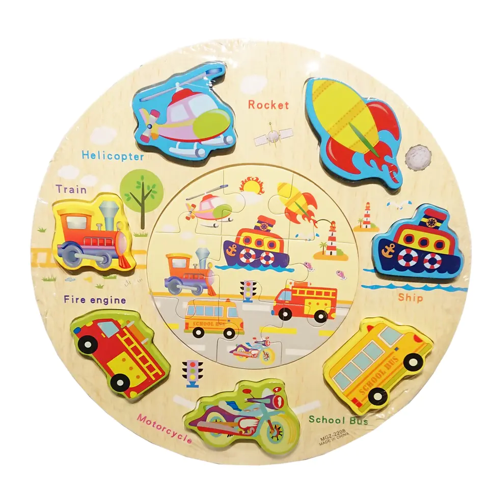 Puzzles come in different patterns: jungle, ocean, tools and vehicles.