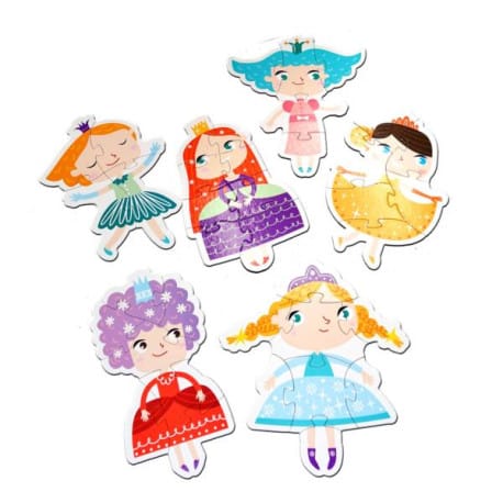 Puzzles for children in a decorative box, Princess, Set of 6 puzzles, 38 pcs. Lovely set of 6 puzzles (4, 5, 6, 7, 2 x 8 el.) in princess shapes in beautiful dresses and with charming accessories. Each puzzle consists of large pieces that are easy to fold and hold in a small handle. The puzzle was packed in a box that can be used as a decoration in the children's room. Thanks to the puzzle, children can train motor coordination, memory, patience. Puzzles support fine motor skills, color and shape recognition, problem solving, and at the same time are a great idea for a pleasant pastime. Product details: The set contains 6 puzzles (4, 5, 6, 7, 2 x 8 el.) in various shapes, 38 large pieces. Each puzzle has a dimension of approx. 18 cm x 12 cm. The puzzle attracts the attention of children, stimulates their memory and development. A solid cardboard box attractively printed inside, can be a wonderful decoration of the children's room. Dimensions of the puzzle: 18 cm. height. Package dimensions: 26 cm x 5.5 cm x 18 cm. Age rating: 3+. Barbo Toys products are designed in Denmark, with special attention to sustainability and high-quality materials. The toys are manufactured according to the philosophy of "learning through play" and actively support and stimulate both the imagination and education of the child, while being characterized by excellent Scandinavian design. BAR5853