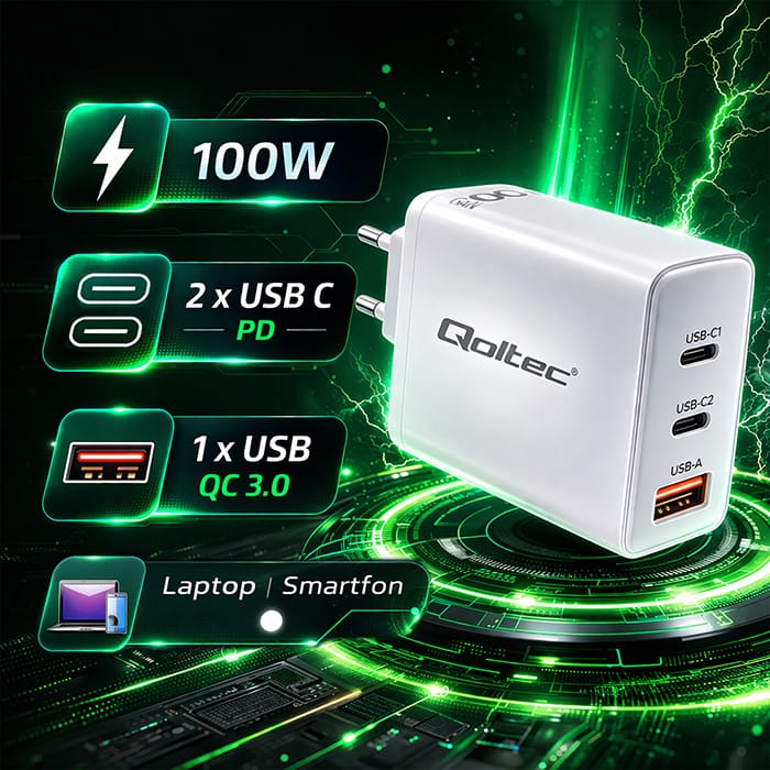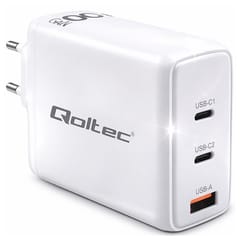 What is GaN technology? The Qoltec brand charger is equipped with the most advanced GaN charging technology based on the use of a new gallium nitride semiconductor material. Depending on the type of device being charged, the charger selects the correct voltage and amperage according to the battery parameters, protecting the battery from overheating. It delivers maximum power to mobile devices in an extremely short time and is much more effective and energy-efficient than traditional chargers, generating significantly less heat. Which means that the cost of electricity consumption during charging will be much lower.POWER DELIVERY or Precise adjustment of charging parametersOur charger can charge 3 devices simultaneously, precisely adjusting the maximum voltage and amperage to match the battery parameters of the connected equipment. This uniquely functional device can charge a battery in as little as 30 minutes to approximately 60%.The charger supports USB type C POWER DELIVERY and has a USB socket A compatible with Qualcomm Quick Charge 3.0 technology.Charge your devices in record time - Discover the benefits and possibilities of GaN technologyThe ultra-fast and energy-efficient charger is sure to meet the needs of anyone who values convenience and time-saving.You can conveniently use it at home, at work, what's more it can easily accompany you on any trip as a charger for your smartphone, smartwatch, laptop, wireless headphones and many other devices. Ultra-modern designMade with attention to every detail. Solid construction and functionality, are among the greatest advantages of the product guaranteeing convenience and comfort of use, and universal colour and ultra-modern design further increase the attractiveness of the charger. It is worth mentioning that using one charger for several devices will not only save you money and space, but will also allow you to reduce electronic waste, which will undoubtedly have a positive impact on the environment.Your safety is important to usQoltec GaN ULTRA brand chargers are not only efficient, compact and fast, but also safe, featuring significantly lower failure rates, no overheating and no overcharging of the battery - they always adapt to the needs of the connected device. In addition, the high quality of the materials ensures complete safety of use.