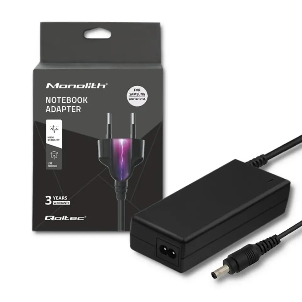 Qoltec 50015.60W Power adapter for Samsung | 60W | 19V | 3.15A | 5.5*3.5+pin | +power cable