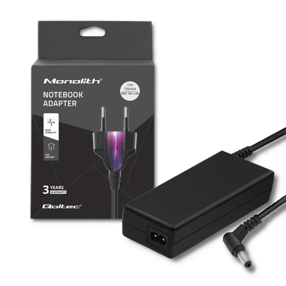 Modern, high-efficiency, Qoltec AC adapter dedicated for Toshiba laptop. You can enjoy it at home and at work, as a primary or backup power supply. Equipped with advanced technologies (security) overvoltage, overload, short circuit and overheating, it is safe to use. It is characterized by low energy consumption and high efficiency. Includes power cord and velcro where you can adjust the length of the Qoltec adapter cable.