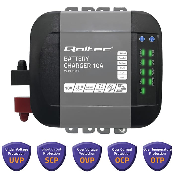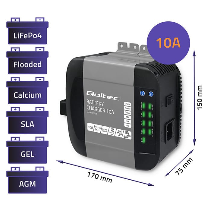 Qoltec 51958 Smart Monolith charger for LiFePO4 AGM GEL SLA batteries | 10A | 12V
