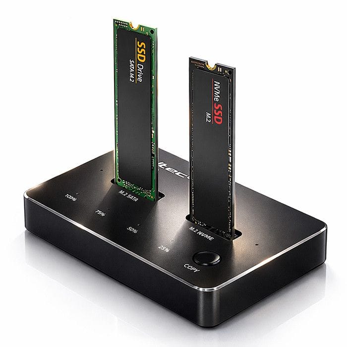 High-speed data transfer, two options for copying dataInstalling an SSD is easy, quick and requires no specialist technical skills. The only thing to do is to insert the NVMe or SATA SSD into the docking station, select the appropriate drive on the station.The station allows two ways of copying:The first option is to place the M.2 SSD hard drive in port A or B, connect the station to power using the included power adapter, and then use a USB C 3.1 cable to the computer.The second option is an offline copy function. All you need to do is place two drives in ports A and B, where the capacity of the B drive relative to the A drive should be greater or equal and turn on the power. Copying starts when the COPY button is held down. Solid and lightweight constructionThe product is characterised by its ergonomic shape and minimalist and elegant design, creating a perfect aesthetic of the device, so it will fit into any type of room. The lightweight aluminium casing, will provide you with full comfort of use. In addition, the cushioning function of the device is guaranteed by non-slip feet that stabilise the casing against movement during use.