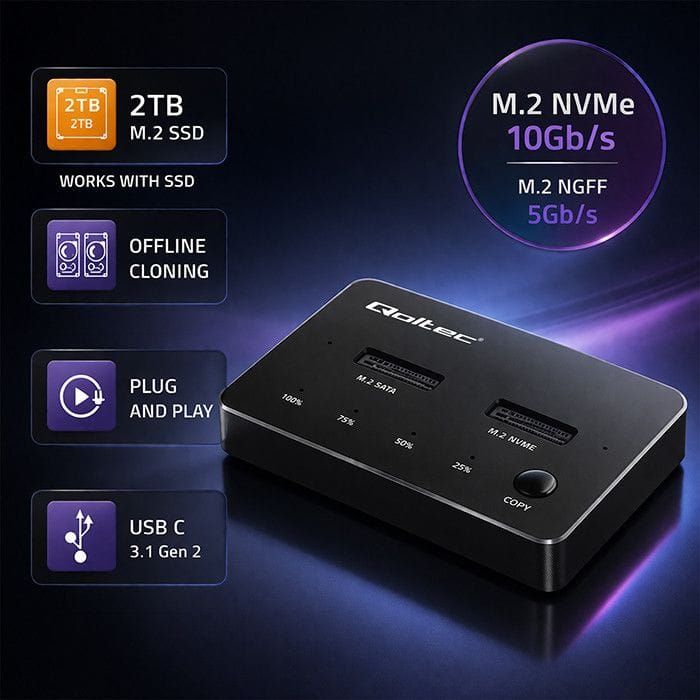 We create solutions that make a difference in everyday lifeThe Qoltec SSD docking station is the ideal solution not only for people who have documents or private files on disks, but also for small businesses who want to archive their computer data without investing in other expensive solutions. The hard disk docking station can also be connected to a TV or monitor equipped with a USB port - then it will act as a video player with a huge storage capacity, if you collect photos and videos on hard disks, then this product is dedicated to you.Support for M.2 SATA and NVME drivesThe station is compatible with M.2 drives with SATA and NVMe interfaces. It offers data transfer rates of up to 10 Gbps. In addition, the disk station from Qoltec is a device: