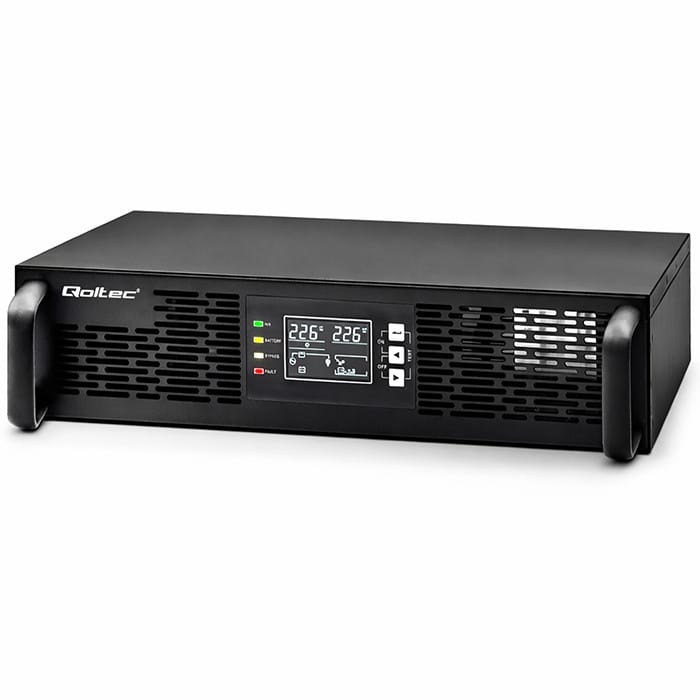 Pure Sine Wave - highest quality and security of power supply for your devicesQoltec RACK UPS units offer stable interference-free pure sine wave power. It's complete protection for your devices, thanks to the double conversion, which first converts the AC of the mains supply to DC and then to AC, ensuring the highest level of power quality and protecting against potential mains disturbances such as voltage drops, power outages, surges and failures.Your reliable partner in keeping your equipment up and running An online UPS has a voltage that is continuously recycled; in the event of an unexpected drop in mains voltage, the UPS maintains the operation of the connected device, thanks to the built-in batteries, which are continuously charged. Thus, mains power is only needed to charge the batteries. Permanently connected devices always receive clean energy, without interference from the battery, so the output voltage of the online UPS will always be constant, regardless of the input voltage. The back-up time of the equipment is from a few minutes to several minutes which allows data to be saved and the equipment to be switched off safely, minimising the risk of data loss and equipment damage.Manage your power supply with ease thanks to the easy-to-read LCD displayThanks to the integrated LCD display, managing the unit becomes intuitive and convenient. On the screen you receive up-to-date information on the operating status and key parameters of the power supply. This ensures that you are kept up to date with the operation of the unit, allowing you to react quickly to any problems and to optimise the operation to suit your needs. Working with the power supply becomes easy, fast and reliable, allowing you to concentrate on your main tasks without worrying about the stability of the power supply.