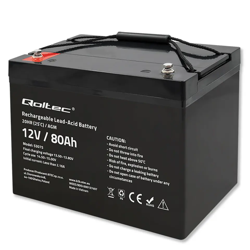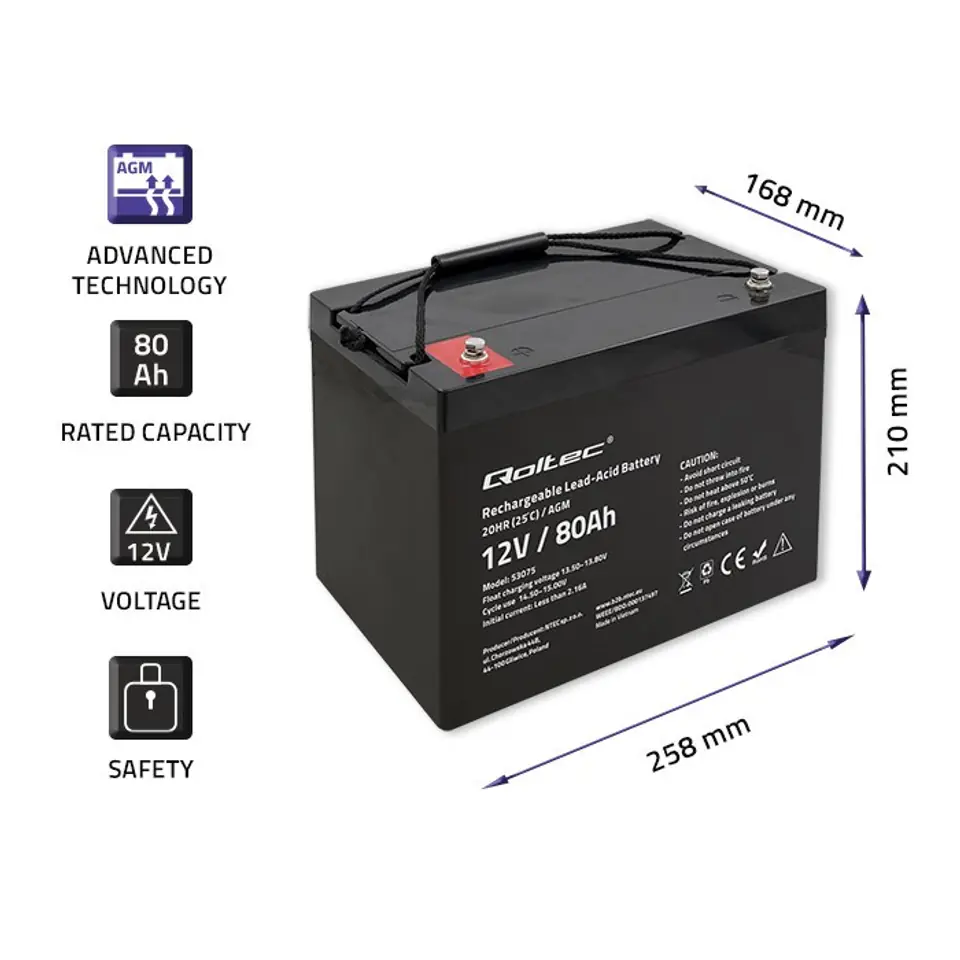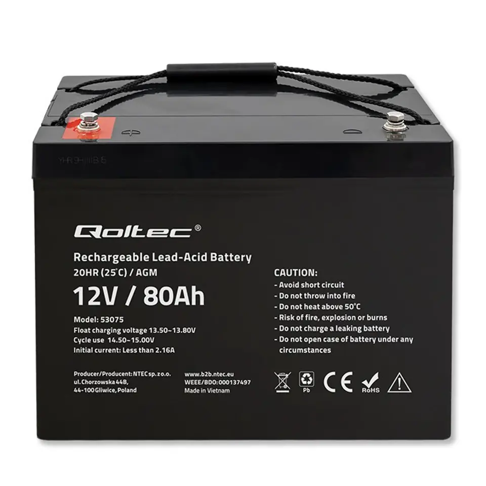 Your stable energy source for everyday and holidayWhile performing daily activities or being at work, you certainly use devices that need electricity to function properly. Some of them draw power from the grid and are exposed to voltage fluctuations or power outages. For smooth operation, it is necessary to have an emergency power source. These include:- alarm and monitoring systems,- emergency lighting,- medical equipment,- scales and cash registers.Others have internal combustion engines and rely solely on battery power. Among them are:- quads,- forklifts,- scooters,- boats,- campers.To provide them with a stable and safe power source, we have prepared a wide range of solutions. Check out Qoltec's offer of AGM batteries and choose the variant that best suits your needs.Don't be caught off guard. Find out how an AGM battery performs at its bestWondering where our battery is best applied? As a primary power source or as a backup power supply for devices usually connected to the electrical grid? We'll answer honestly: we recommend using the 80Ah AGM battery for buffer operation. Why?Buffer operation mode is recommended for AGM technologyThe battery used will function very efficiently and enjoy a long lifespan - up to 10 years, as emergency power in buffer operation e.g., for UPS power supplies, in alarm systems, emergency lighting, or internal combustion vehicles.What is AGM technology?The AGM (Absorbent Glass Mat) technology, in which our batteries are designed, means that the electrolyte contained in the battery is absorbed by special mats made of highly porous glass fiber placed between lead plates. This solution allows for longer battery life, thanks to the slow discharge process.Reliable from every angle - the safety of your AGM battery-powered devicesFeel safe - the advantage of AGM batteries is undoubtedly their maintenance-free nature, and their reliability is maintained for a long time. This is possible thanks to a construction characterized by:- enclosure sealing,- shock resistance,- the ability to be mounted in various positions.When you buy a 80Ah AGM battery, you receive full reliability guarantee. Do you want your equipment to work at full capacity without limitations? Now you can be sure it will receive the necessary energy without compromise.Long-lasting battery life - enjoy energy for much longer!Another advantage of our batteries is their maintenance-free lifespan, allowing them to work up to 10 years!This is possible thanks to the use of the highest quality components, including pure (non-recycled) lead. It is free from any impurities that could reduce the battery's capacity. Meanwhile, the housing is designed with high-quality material in mind to maximize the battery's lifespan by protecting its interior.Take care of your battery, and it will serve you for many yearsRemember, proper use and care of the AGM battery are crucial for its lifespan. Frequent and deep discharge will certainly not positively affect its efficiency. To enjoy a long battery life, try to:- avoid deep discharge,- ensure proper charging - do not charge the battery with too high a current,- avoid very low temperatures or prolonged exposure to high temperatures- use a charger suitable for the specific type of battery.How to properly charge an AGM battery for its longest lifespan?AGM batteries require charging with the so-called constant-voltage method, initially with direct current, and then with constant voltage. This way, you can avoid the risk of damaging it through improper charging.