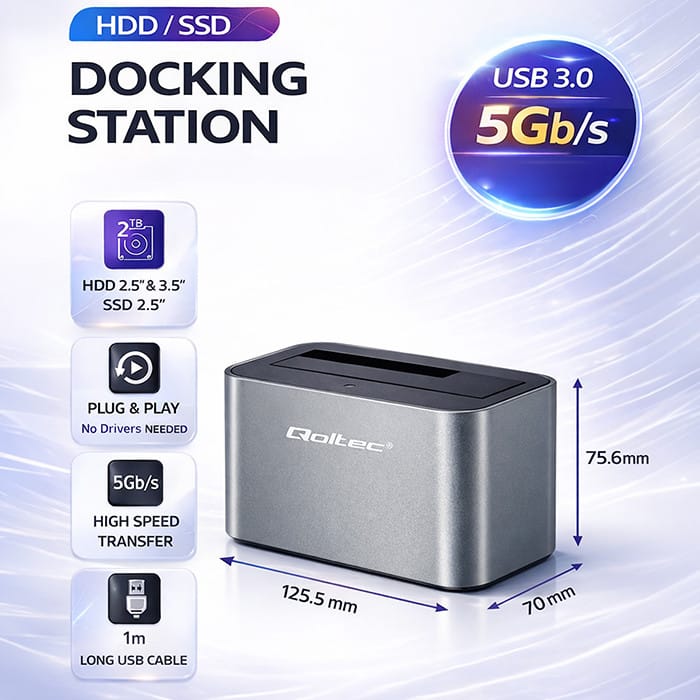 Ekstermalna pamięćUrządzenie stanowi ciekawą alternatywę nie tylko dla osób przechowujących dokumenty lub prywatne pliki na dyskach, ale również dla małych firm chcących archiwizować swoje dane komputerowe nie inwestując w kosztowne rozwiązania.Stację dokującą do twardego dysku można podłączyć także do telewizora lub monitora wyposażonego w port USB - wówczas pełnić będzie funkcję odtwarzacza video z ogromnym zapleczem pamięci, jeżeli gromadzisz zdjęcia i filmy na twardych dyskach to ten produkt dedykowany jest właśnie Tobie. Innowacja w Twoim domuNie musisz instalować sterowników, wystarczy podłączyć do portu USB i używać dzięki prostocie funkcji Plug&Play.Minimalistyczny i elegancki design, który nadaje cienka i lekka obudowa zapewnia doskonałą estetykę i komfort w użytkowaniu. Amortyzację gwarantują dodatkowe gumowe nóżki, stabilizujące obudowę przed przemieszczaniem się.