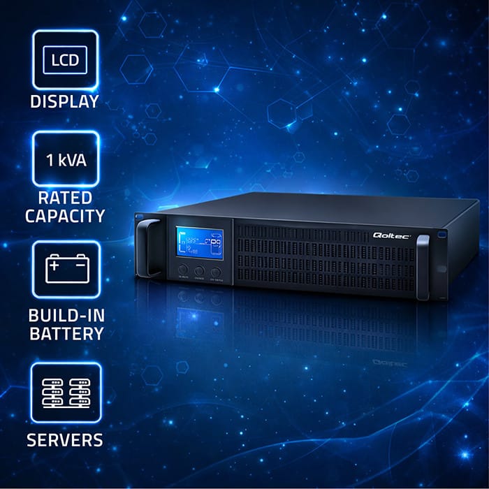 Choose safe and clean energyWhether you have a small server room or run a business in a large office building, and whether you store private data on your server or important information, we understand how crucial safety and maintaining a constant power supply is to you. Don't let power outages and voltage drops affect your work and put your equipment at risk. The RACK UPS, an On-line type UPS 1KVA 800W by Qoltec, is a modern solution that safeguards against power loss, essential for the proper functioning of your devices.Pure Sine Wave - the highest quality and safety for powering your devicesQoltec brand on-line UPS power supplies provide stable, disturbance-free, pure energy with a sinusoidal waveform. This offers complete protection for your devices through double conversion, which first converts the alternating current from the mains supply into direct current, and then back into alternating current, ensuring the highest level of power quality and safeguarding against potential network disturbances such as voltage drops, power outages, surges, and failures.How does an on-line UPS work?An on-line UPS continuously processes voltage, and in the event of an unexpected drop in network voltage, the power supply sustains the operation of the connected device through built-in batteries, which are constantly recharged. Therefore, power from the network is only required for recharging the batteries. Devices permanently connected to the UPS will always receive clean, disturbance-free power drawn from the batteries, which is why the output voltage of the on-line UPS will always remain constant, regardless of the input voltage. The runtime of the devices is several to several dozen minutes, providing enough time to save data and safely shut down the equipment.Discover a better work formatThe Qoltec RACK UPS 1kVA offers:- clean energy with a sinusoidal waveform, free from disturbances,- zero switchover time, which is the speed at which the UPS switches to battery mode in the event of a power outage,- protection against overloads, short circuits, and overheating,- double conversion, providing stable power parameters,- ECO mode - provides the best balance between energy savings and power protection,- Extended runtime - additional time during which the UPS will independently power the devices connected to it in the event of a main power outage,- True Isolation technology - provides the most comprehensive power protection and the highest energy quality for all IT applications,- Built-in Service Bypass - for seamless device maintenance,- the option to install an SNMP card or connect an SNMP adapter, a network management standard for gathering information about connected devices and configuring their parameters (compatible SNMP module: product code 50386),- RS-232 port and RS-232 cable - a communication interface designed for serial data transmission,- built-in set of 2 batteries,- one fan - provides intensive cooling for the device during continuous operation.Clear LCD displayThe LCD display ensures easy device management. You receive real-time information about the status and parameters, making working with the power supply easy, fast, and reliable.