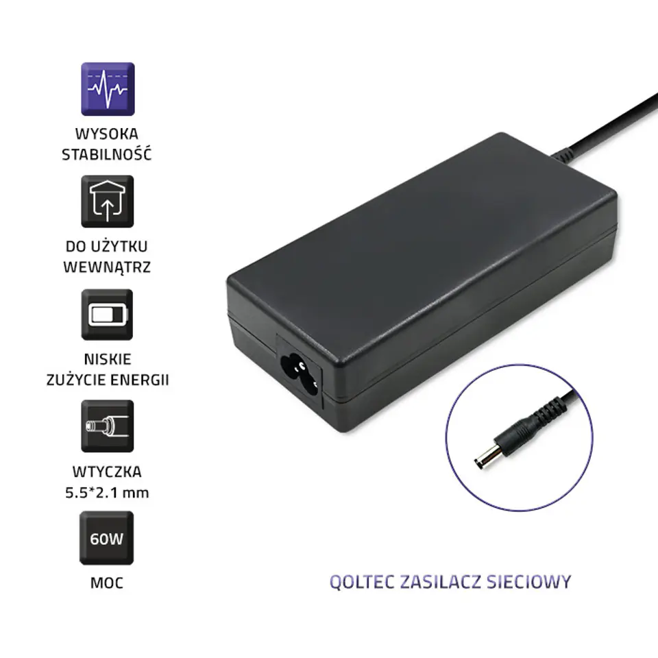 - thermal, it is protection against overload or poor air circulation. Do you care about the high quality of the product you buy? Our solutions will meet your expectations. Each of the power supplies we offer is covered by a 36-month warranty valid from the date of purchase. Qoltec5.5*2.1mm60 W220-240 V12 V5 A50 - 60 HzSurge ProtectorOverloadOverloadShort-circuitThermalAC/DC AC Power Adapter designed for telecommunications equipment and automatic data processing equipment and devices for these machines1.16 m59 x 130 x 31 mmDesktop Power SupplyPower Cable Warranty CardUser manualVelcro for cable cleaning50 mm240 mm130 mm0.3520 kg0.4100 kg36 months