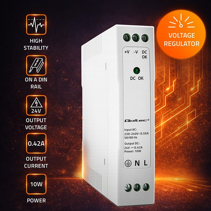 Qoltec DIN rail power supplies are a useful element of automation, machine control, lighting technology and industrial electronics systems, in which the size of power supply devices and their adaptation to limited space are important.