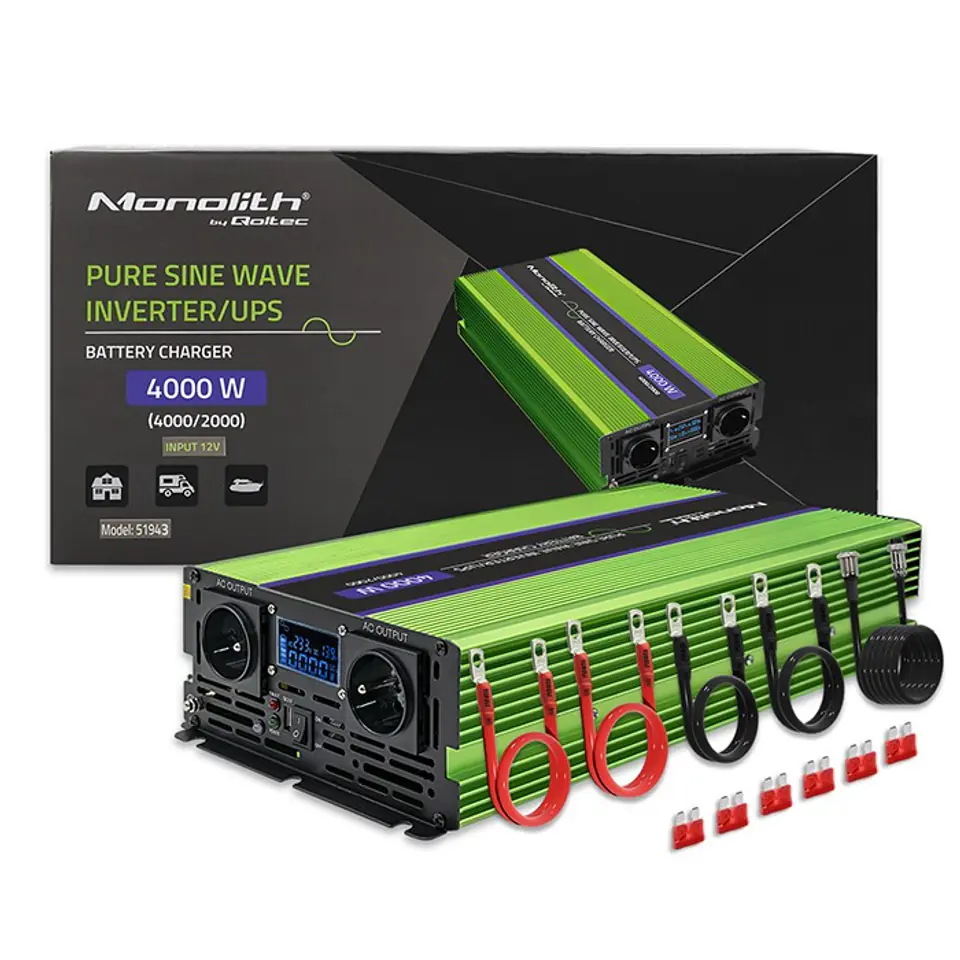 The inverter can also be used not only on the go, but also as an emergency power source, such as backing up the CO furnace or to power equipment as a UPS during a temporary power outage from the power grid.Multifunctional LCD displayThe inverter is equipped with an LCD display, which informs us about the current battery level, the power of the connected devices, and the AC and DC voltage. You can monitor the operating parameters of the device, making it easy, safe and reliable to work with the inverter.Durable and lightweight housingThe case is designed from high quality aluminum that is resistant to shock and mechanical damage. It is an ideal choice for those who like to travel for long periods of time. Thanks to the inverter with built-in power socket, you can use almost any device that requires connection to the socket. Equipped with an LCD display , which monitors all the most important parameters of the device. The product has a USB port for charging mobile devices and a fan that takes care of proper cooling.Convenient inverter power managementSwitching the inverter on using an additional cable with a switch can be a practical solution in many situations. The cable will allow you to manage the power to the inverter, which can be useful if you need to switch the unit off or on quickly. With an on/off switch, it can be quickly switched off when not needed, which can help save energy or can be a quick way to stop the power supply in the event of an emergency.Full guarantee for safe useThe product is equipped with a number of protections that guarantee full protection for connected devices. In addition, the kit includes a spare fuse to ensure the longest possible operation of the equipment.The converter has:
