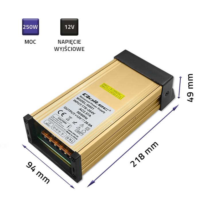 Qoltec Power supply: LED switching mode IP45 | 250W | 12V | 20A | Waterproof 0NC