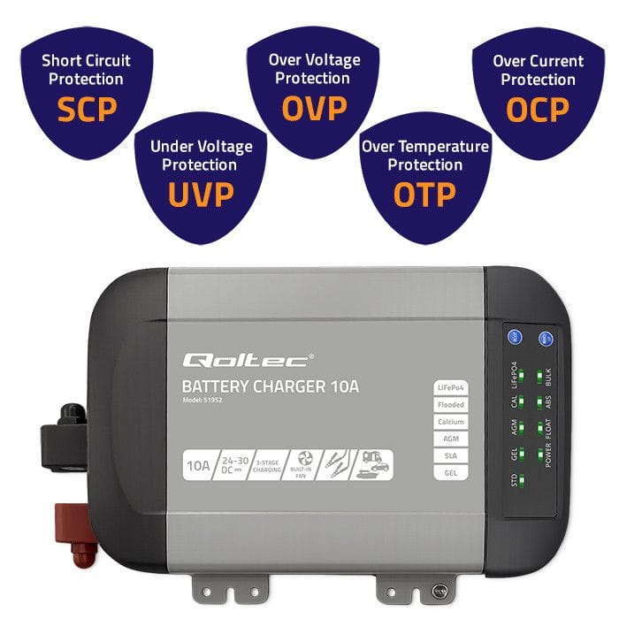 Qoltec Smart Monolith Battery Charger for LiFePO4 AGM GEL SLA batteries | 10A | 24V
