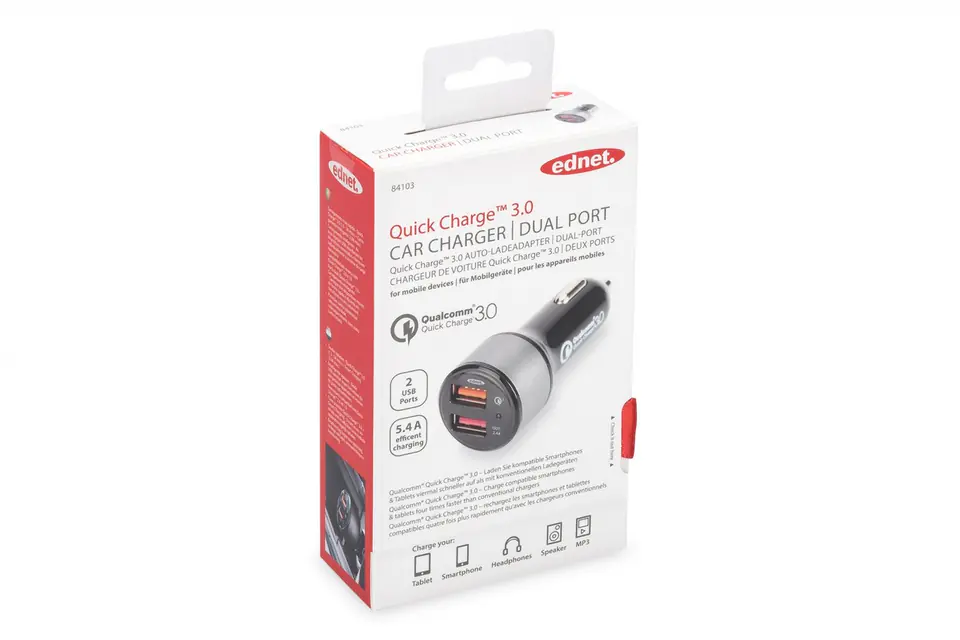 - Qualcomm® Quick Charge ™ 3.0 - charges compatible smartphones and tablets four times faster than conventional chargers (up to 80% within 30-35 minutes)