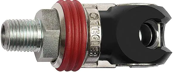 Execution: With free flow. Housing made of steel with NBR seals. The nipple is plugged into the connector body, the connection is made by rotation of approx. 90°. A secure connection is formed when the red ring clicks into the groove. To disconnect the connection, the red ring must be pulled back and the nipple should be tilted to the bumper to the starting position. The venting hole on the back of the quick coupler is vented during disconnection. These couplings meet the requirements of ISO DIN EN ISO 4414, EN 983.