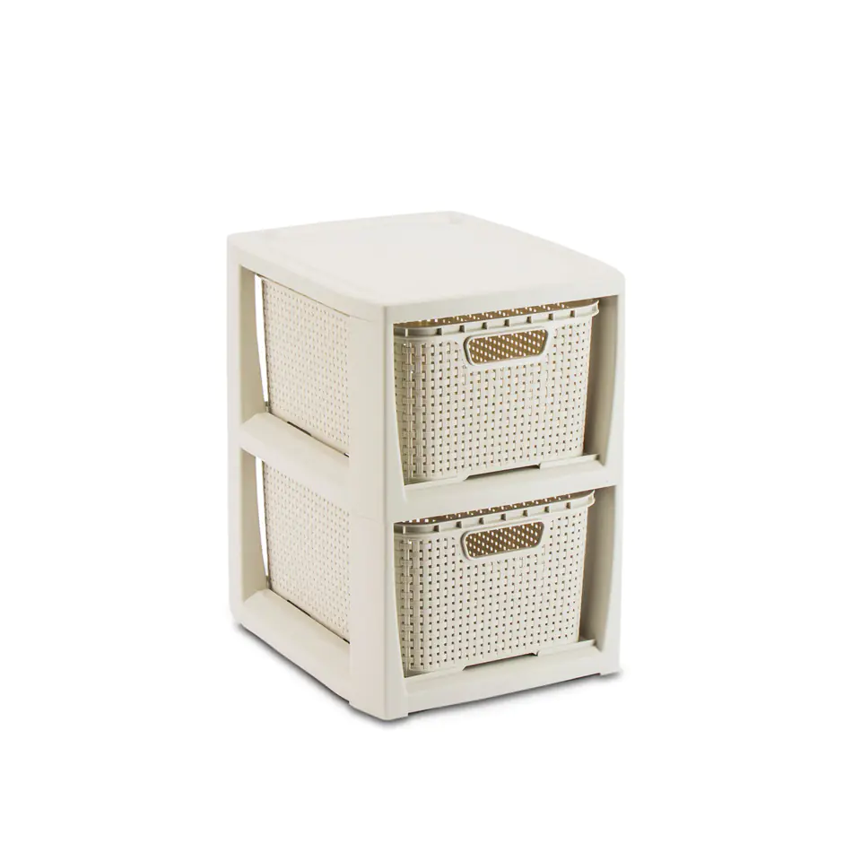 Rattan bookcase in anthracite color with 2 baskets that take the form of drawers is a practical way to store the necessary accessories in the bathroom, bedroom or wardrobe. It is made of high quality moisture-resistant plastic. The lightweight design of the rack makes it easy to carry. The surface of the baskets resembles rattan braid. The smooth surface inside the drawer does not hook (does not damage) clothes. Very easy to keep clean, just wipe with a damp cloth.