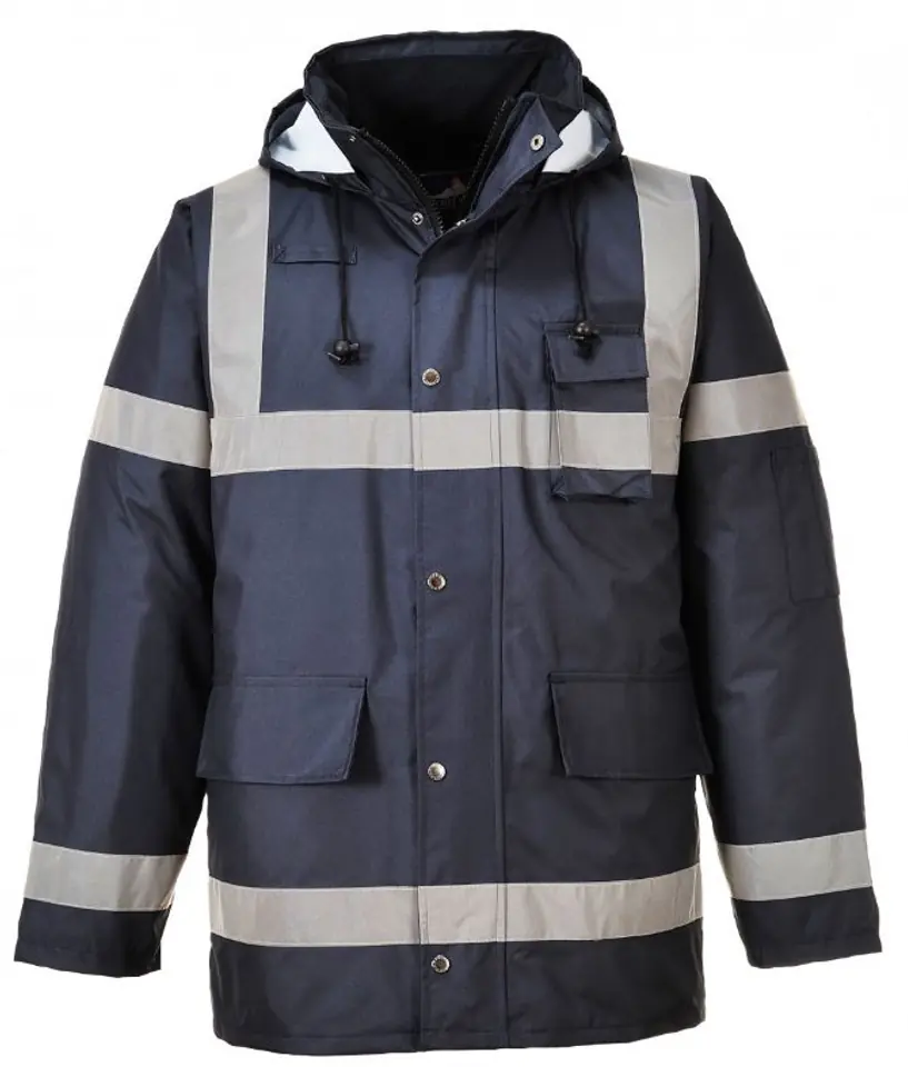 It has two large side pockets, a pocket for a phone and/or walkie-talkie, a hood hidden in the collar and an adjustment at the bottom.