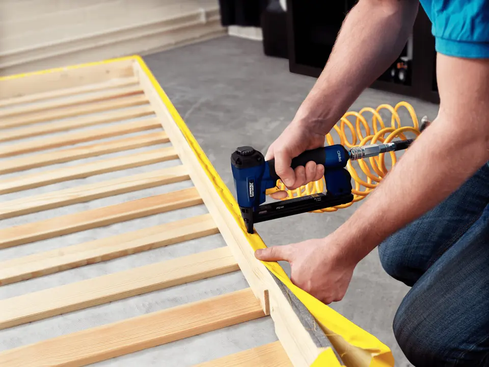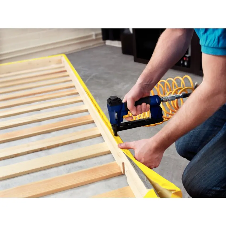 Perfectly balanced, professional pneumatic stapler with magnesium alloy housing streamlines and facilitates work. The PS141 is part of the Airtac™ product family and is suitable for upholstery, padding and fastening of all kinds of fabrics with staples No. 12 (up to 16 mm). The long nose, comfortable grip and depth adjustment mechanism allow for optimal precision. Other key features that are helpful in everyday work are: fast loading system, adjustable air discharge and safety cap. The nailer is delivered in a sturdy case with the necessary equipment. The tool is covered by a 2-year warranty.