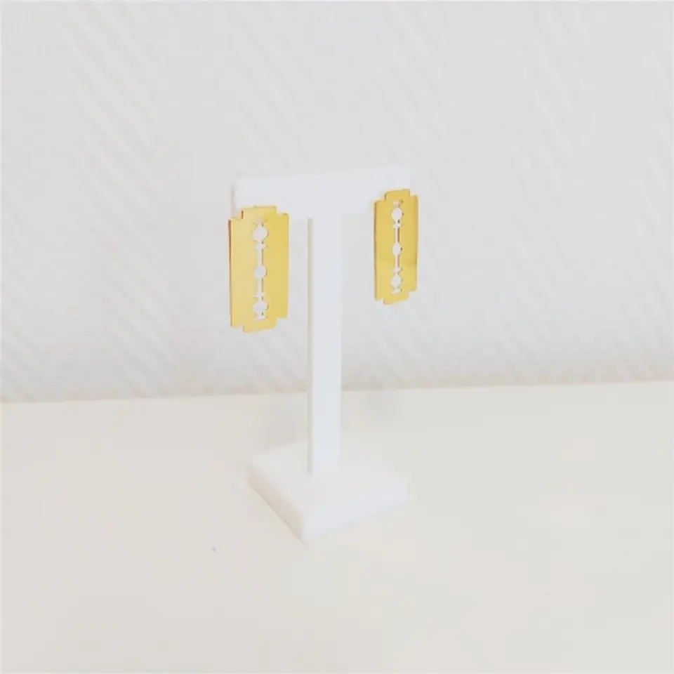 Earrings created for the ambassador of the Colibra brand Kamila Wybrańczyk for the FAME MMA conference. Razor blades measuring 4.5cm x 2.3cm. Gold-plated earrings.