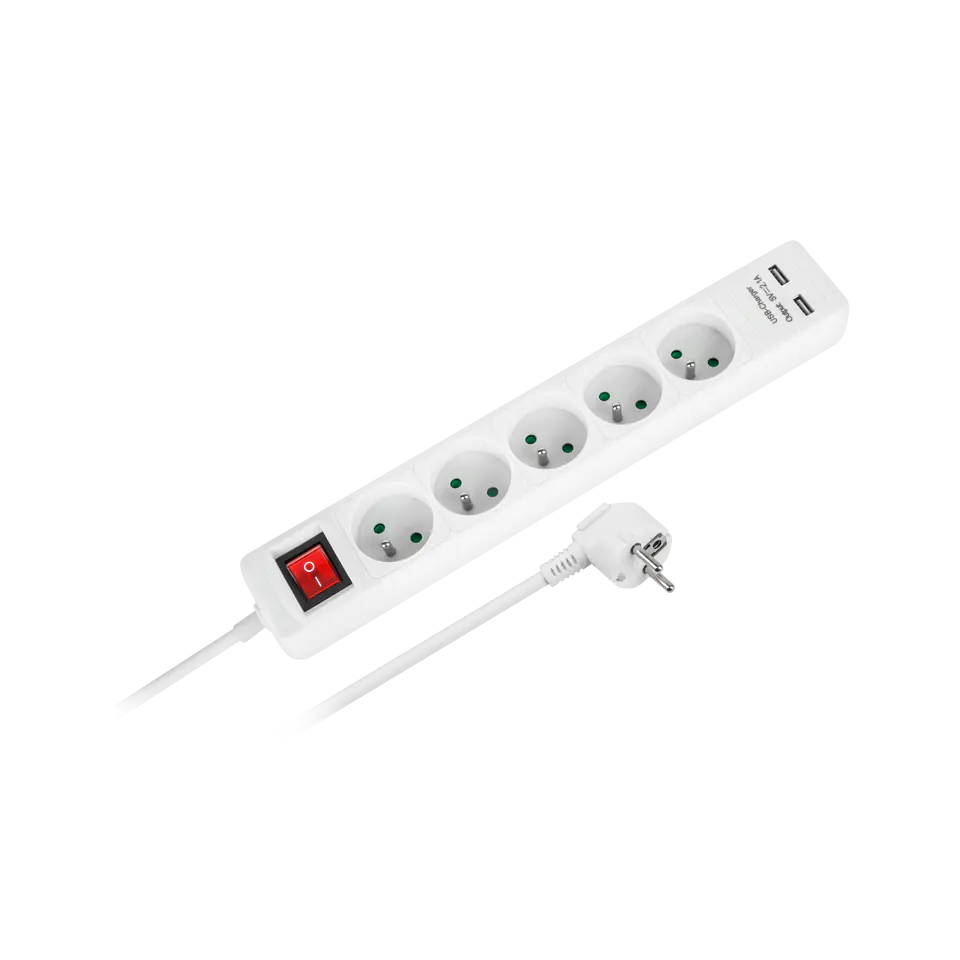 KEMOT mains extension cable with switchType: Polish, 5 sockets + 2 USB sockets (2.1A)Cable:- length 3.0 m- cross-section: 3G 1.5 mm- whiteVoltage: 230-240 V AC 50HzMax. current: 16AMload max.: 3500WFor internal use