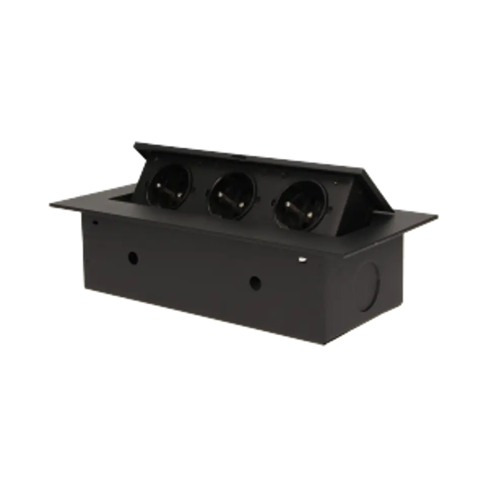 A set of three mains sockets with grounding and current track apertures in a housing hidden in the tabletop. The device is designed for installation in desks, countertops and tables, it can be mounted both vertically and horizontally, providing access to electrical outlets. Recommended OWY 3 × 1.5mm cable? (not included). Available colors: black, silver.