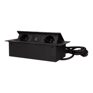 Recessed furniture socket with flat milled edge, USB charger and 1.5m cable, 2x2P+Z, 2xUSB, black