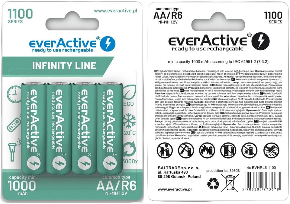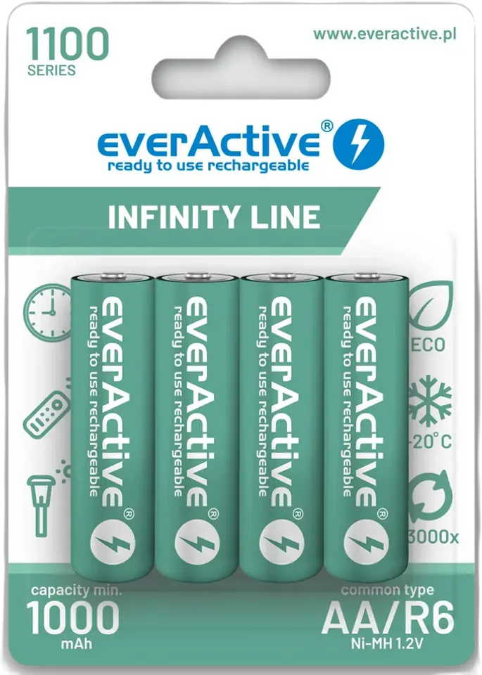 4 x innovative R6 AA 1100 mAh everActive battery made in "ready to use" technology.