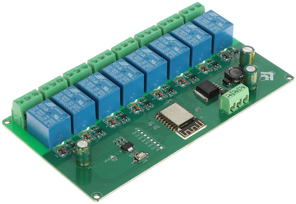 Esp12-8R-D8 module allows wireless control of 8 relaysCommunication with the device is carried out via Wi-Fi interface