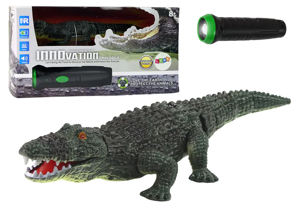 The remote control included in the set resembles a flashlight. It has three buttons - front, back and control button. Here's a surprise! The crocodile reacts to light, follows it, so light is its pilot. A super toy for explorers of nature and the surrounding world.