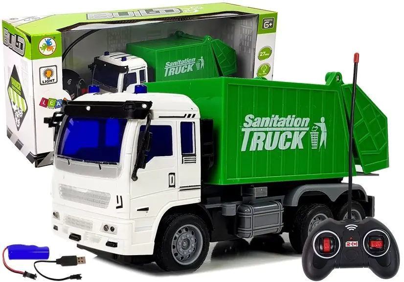 The garbage truck is powered by a 3.7 V / 500 mAh battery, which is included in the set. Use 2 "AA" 1.5V batteries (not included) for the remote control. The toy is intended for children over 6 years of age. The set is CE certified and complies with EN 71. It is packed in a cardboard box with a transparent showcase, making it ideal for a gift.