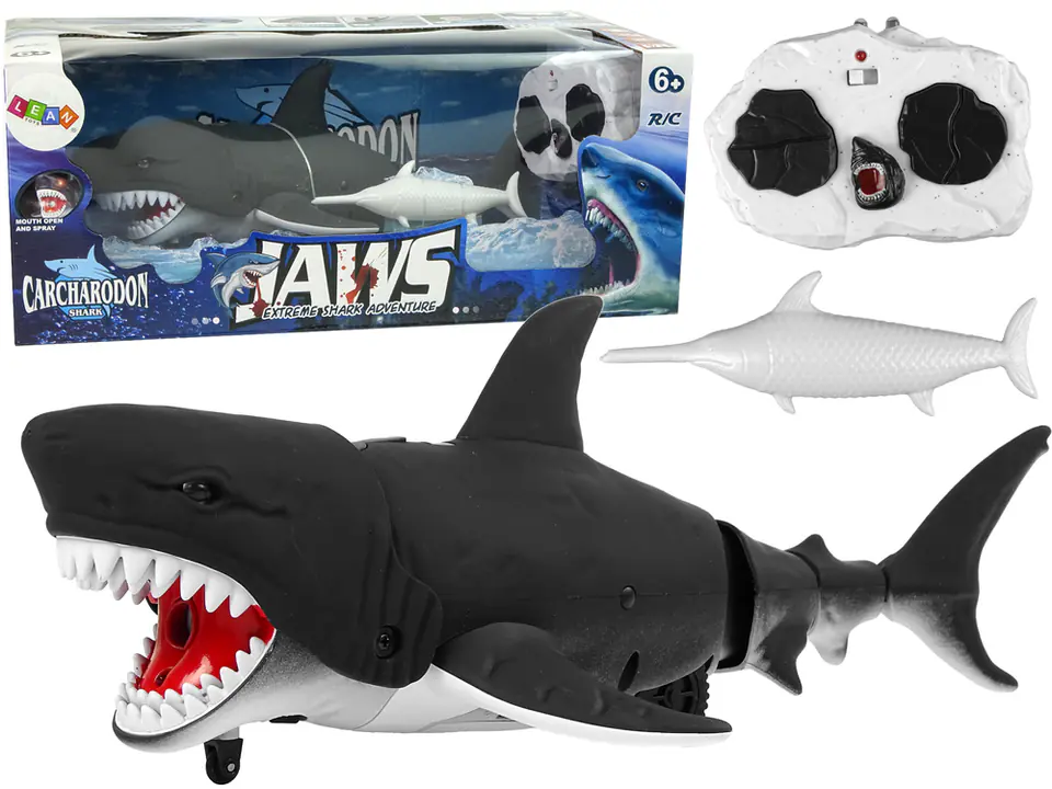 The toy is made of the highest quality plastic. Every detail, characteristic white teeth, sharp fin on the back, long tail arouse horror. A great advantage is infrared remote control. You can control it with the remote control. While playing, he moves his tail and the entire waist, glowing eyes and the way he moves resembles a real shark. The biggest surprise is the water sprayer function. On the back there is a hole into which you need to pour water, attached with a pipette in the form of a swordtail, after pressing the button on the remote control, the shark will begin to move its head and use a sprayer.