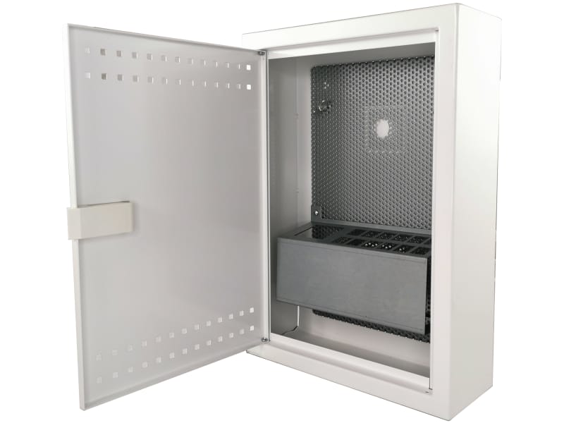 - The cabinet is equipped with an openwork back wall that allows you to install an active device or mounting plate anywhere.