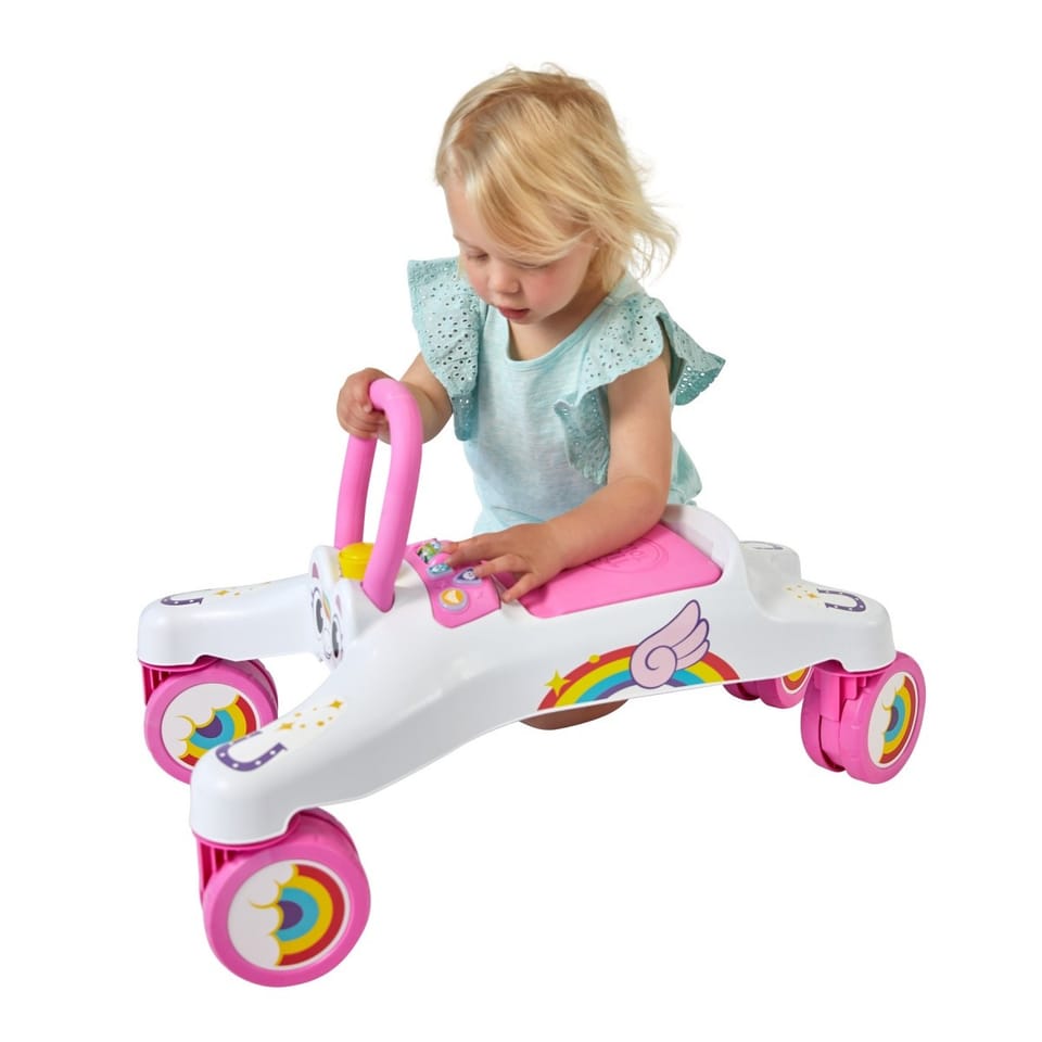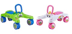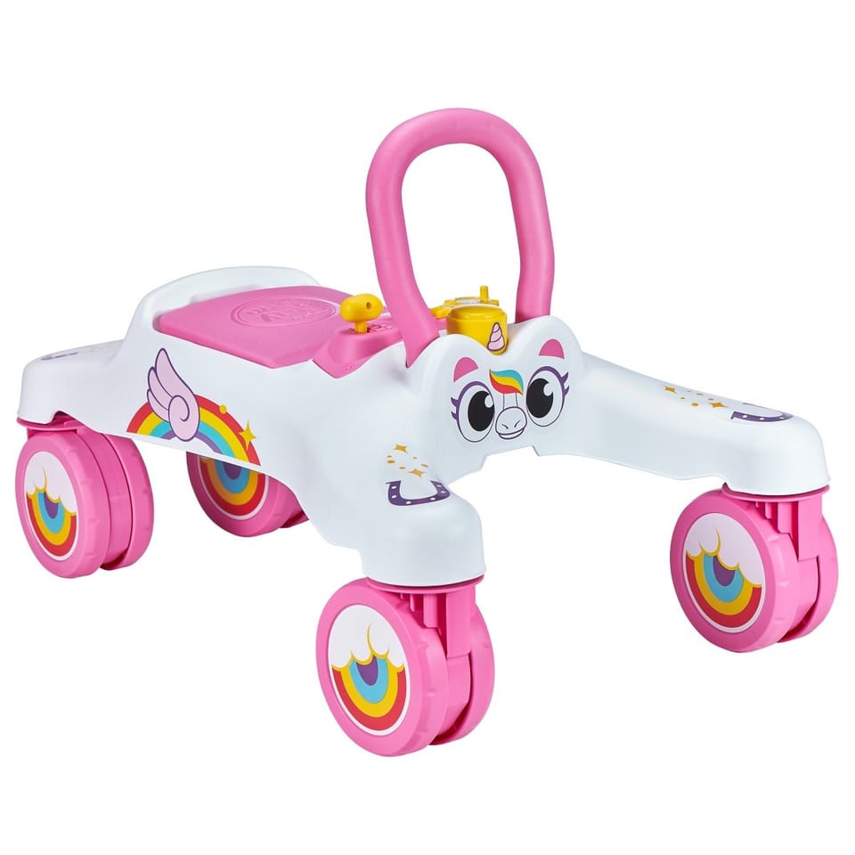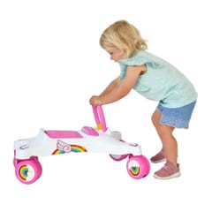 The standard animal-themed ride-on is available in two versions: a green frog and a white unicorn. It has 360° swivel wheels that provide a wide range of movement. It is equipped with a horn and a secret compartment under the seat. The strong structure ensures children's safety and balance while riding. The ride-on does not require assembly, it is ready to use.