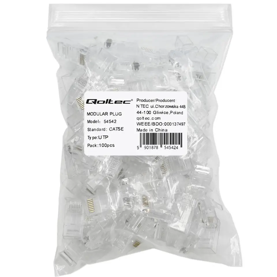 Compatible with UTP Cat5e patchcord cablesA high quality set of transparent RJ45 connectors with a Pass Through design, compatible with UTP Cat5e patchcord cables. The connector has gold-plated metal contacts for improved conductivity and corrosion protection. Ideal for use in telecommunications, computer network installations or for connecting various types of devices requiring network support. Particularly useful for installations where there is a need to connect cables quickly and easily. Remember to ensure that the plugs and cables are category-compatible for optimum network performance.Higher connection reliabilityRJ45 straight-through connectors not only offer significantly better and more precise crimping compared to standard plugs, but also provide higher connection reliability in telecommunications and computer networks. Simply pull all eight wires through the connector, making it easy to control the even and correct order of the wires before crimping. This is the perfect solution for professionals who value efficiency, precision and durability in their installations. We recommend using a dedicated crimping tool.