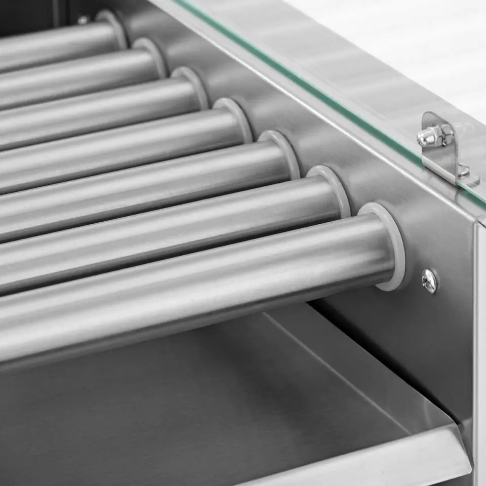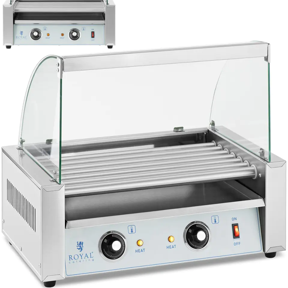 Royal Catering roller grill was created for frying and keeping sausages warm. It will work in catering outlets, at gas stations or in food trucks. 7 powerful heating rollers ensure quick preparation of up to 12 sausages. The rollers have been covered with stainless steel, rotate 360 and evenly heat the sausages. The temperature is controlled between 0-230C. Two heating zones are located at the front and rear of the unit. They are controlled by separate thermostats, which allows you to fry sausages and keep them warm. The drip tray collects excess fat. Use the switch to turn the device on and off. Indicator lights indicate the temperature reached. The grill is made of stainless steel, it is resistant to corrosion and mechanical damage. Tempered glass cover protects food from dirt.