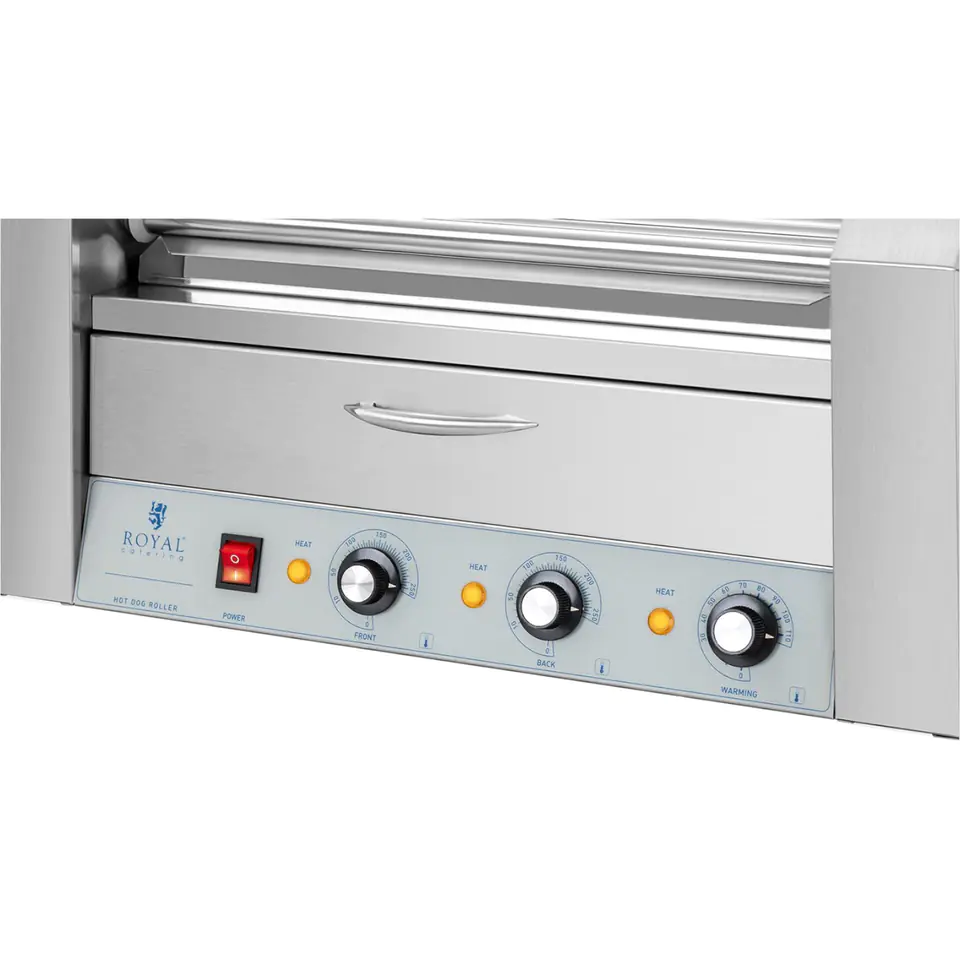 Royal Catering roller grill will work in bars, buffets, gas stations or outdoor events. It allows you to prepare 12 hot dog sausages , frankfurters, kabanos or tortilla sausages at the same time. Uniform rotation by 360 makes the sausage equally browned on each side. The rendered fat is collected in a tray that is easy to remove and wash. The heating drawer ensures that the rolls are heated at a temperature of 30 to 110C. Two heating zones allow independent temperature setting. Sausages can be grilled or only heated. The temperature is regulated in the range of 30-250C. The tempered glass lid protects food from contamination and allows sausages to be prepared in front of customers.