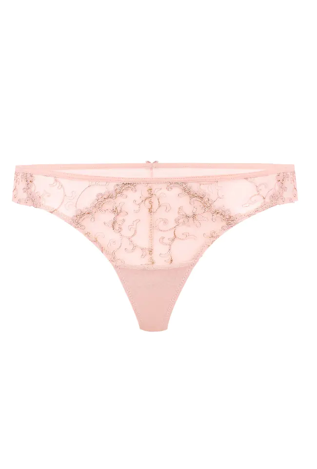 Klasyczne stringi wykonane z delikatnej mikrofibry i tiulu, która subtelnie otula kobiece ciało. W zestawieniu ze zmysłowym haftem Ricamificio di Fagnano z przodu całość wygląda elegancko i seksownie.
