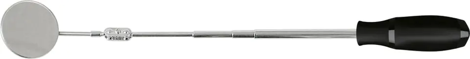 Design: steel mirror housing with metal edging and chrome telescopic tube, with comfortable plastic handle.
