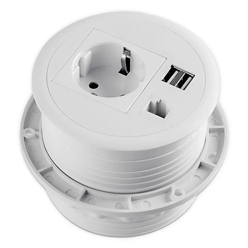 Mediaport Spacetronik ERGOLINE SPS-R1D4W is a modern solution that is used in stores, showrooms, conference rooms, offices and at home. Made of high quality components. The product is designed for indoor installation in desks, countertops and tables, both in a vertical and horizontal position, providing access to sockets. This circular mediaport is equipped with 1 110-250 V socket (germanium type), a dual USB charger and an RJ-45 socket for category 6.