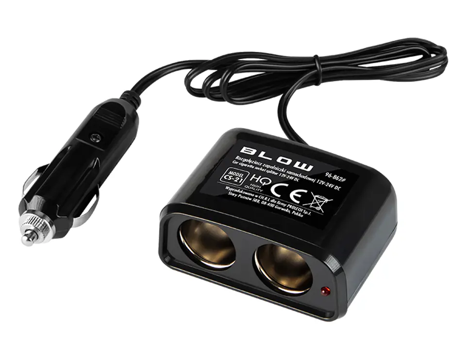 Splitter designed for car installation 12V and 24V. The plug fits standard car cigarette lighter sockets with a diameter of 21 mm. The splitter has short-circuit protection in the form of a replaceable WTA quick glass fuse.