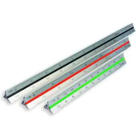 Anodized aluminum scale, printed 6 precision 1:2,5/5/10/20/50/100, coloured marking with rubber bands of grooves between scales, scale length 20 cm, individual packaging