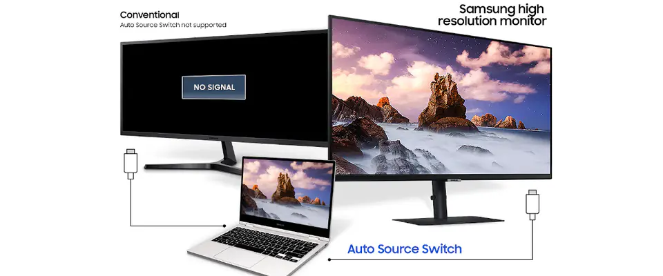 WYSTARCZY JEDEN KABELProsty sposób, by utrzymać porządek na biurku. Monitor Samsung wyposażony jest w port USB-C, umożliwiający przesyłanie danych i równoczesne ładowanie laptopa za pomocą jednego kabla. Możesz także połączyć się z komputerem przez bezprzewodową sieć LAN.