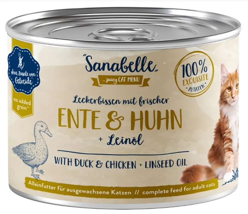 Fresh chicken (30%), chicken broth (30%), fresh duck (14%), fresh lungs (14%), fresh hearts (5%), fresh liver (5%), minerals (1%), linseed oil (1%).