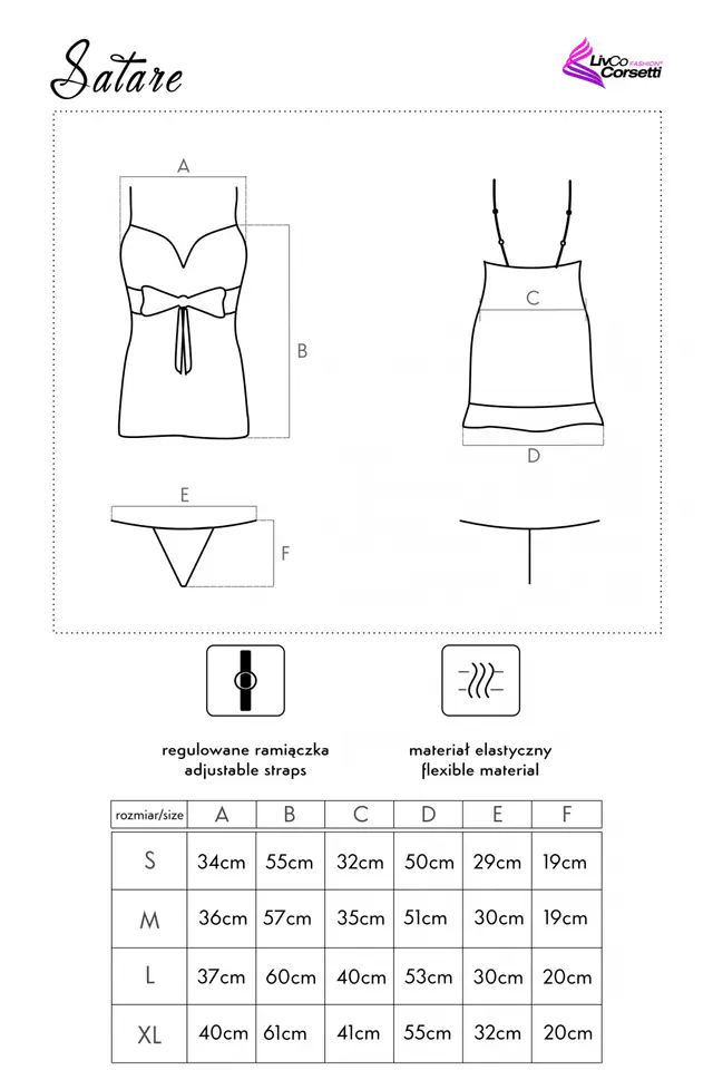 Piękna, wyjątkowa koszulka do zestawu z dopasowanymi stringami. Poczuj się jak modelka we własnej skórze. Fantazyjna i mięciutka koszulka zachwyca indyjskimi wzorami. Cienkie ramiączka i głęboki dekolt pozwalają wydobyć jędrność kobiecych kształtów, a także podkreślić jedwabistość skóry. Wiązany satynowy pas pod biustem pozwala dopasować koszulkę i świetnie oddać wąską talię. Tył gładki, jednobarwny o właściwościach wyszczuplających, pozwalających skupić się na froncie stroju. Dół koszulki zakończony flirtującymi sznureczkami hindi. Błyszczące elementy na tkaninie pomagają lepiej wczuć się w klimat tajemniczego, bogatego Wschodu.S; M; L; XL
