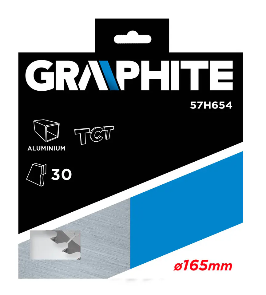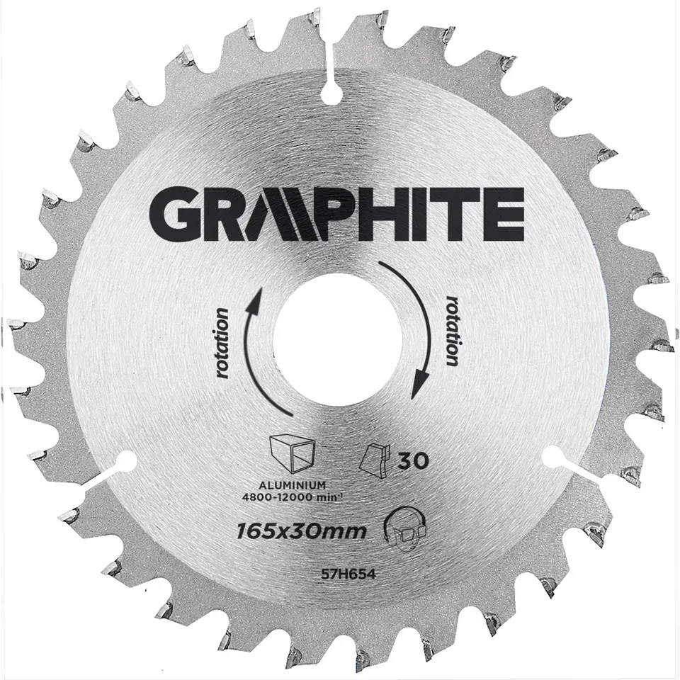 Disc for the GRAPHITE saw (ref. 57H654) with an external diameter of 165 mm, made of MN65 manganese steel alloy with high temperature resistance and deformation. Teeth with YG6A cemented carbide overlays have a special sharpening device that allows you to cut aluminum profiles. The reduction rings included in the package allow the blade to be used for most models of chainsaws.