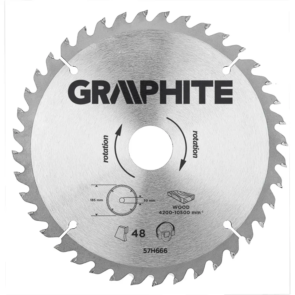 GraphITE forific saw blade (ref. 57H670) with an external diameter of 190 mm, made of MN65 manganese steel alloy with high temperature resistance and deformation. Teeth with YG6A cemented carbide overlays allow for medium accurate cutting of wood and wood-based materials such as plywood, chipboard, MDF. The reduction rings included in the package allow the blade to be used for most models of chainsaws.